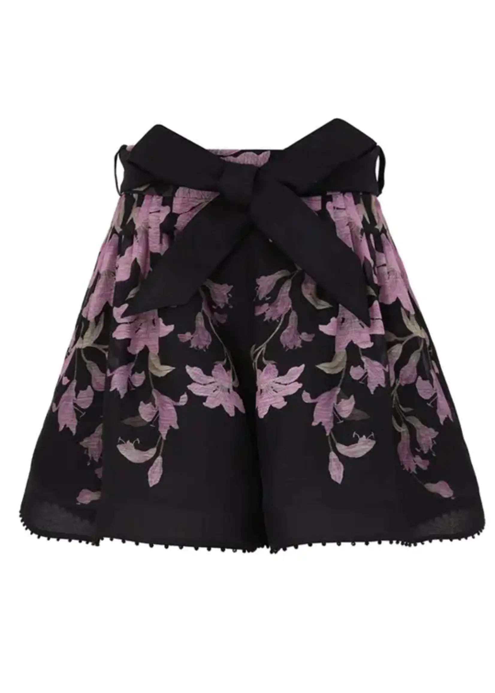 The Dawning Beaded Tuck Short in Black Lily from our Spring 2025 Collection, Illumination. A high waisted silk linen short featuring side seam pockets, fixed waistband, a centre back invisible zip closure and beaded trim on the hemline.